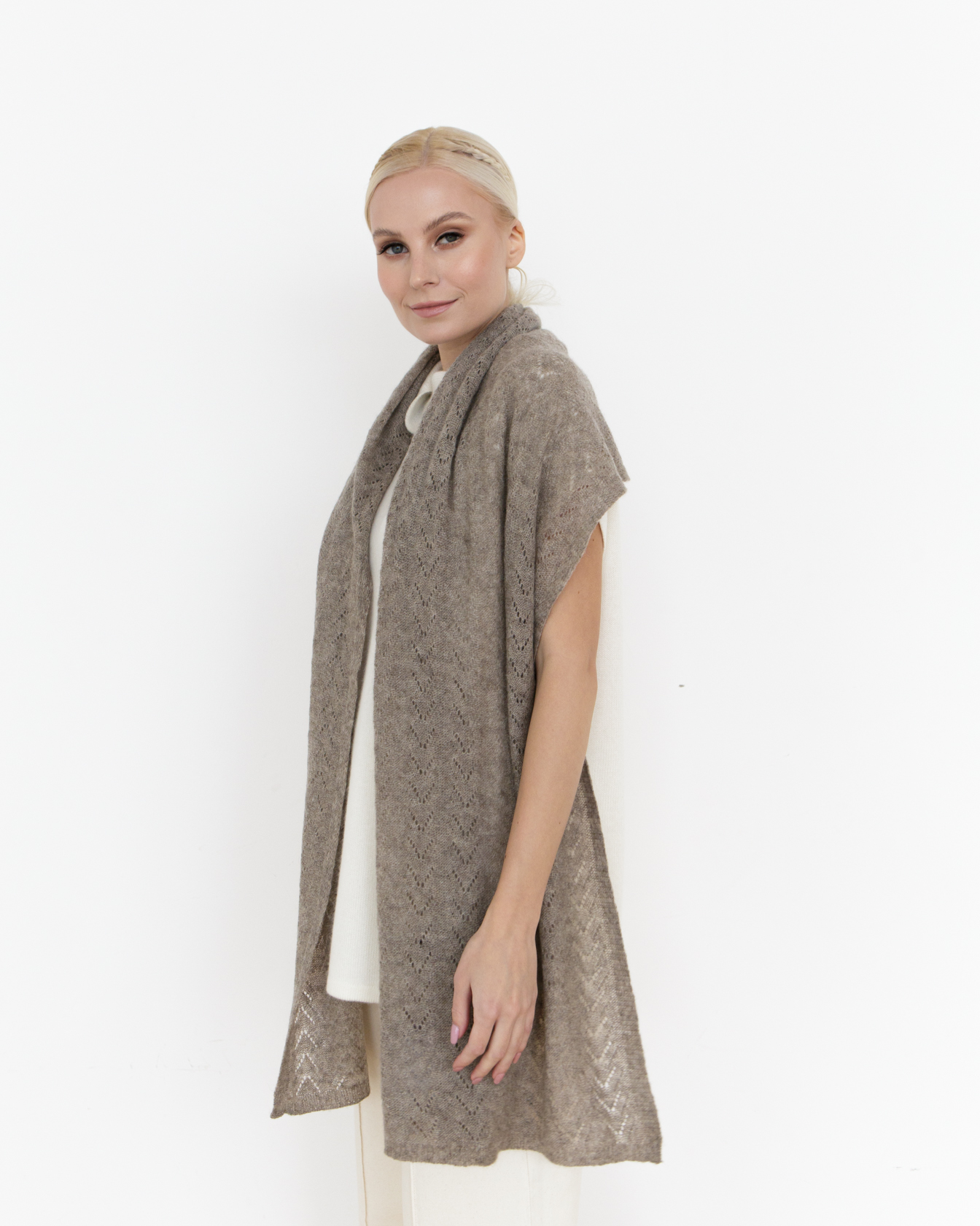 Модель выполнена в классической прямоугольной форме с аккуратной фактурной вязкой. Лаконичный дизайн делает палантин универсальным аксессуаром, который легко сочетать с пальто, кардиганами и трикотажем.