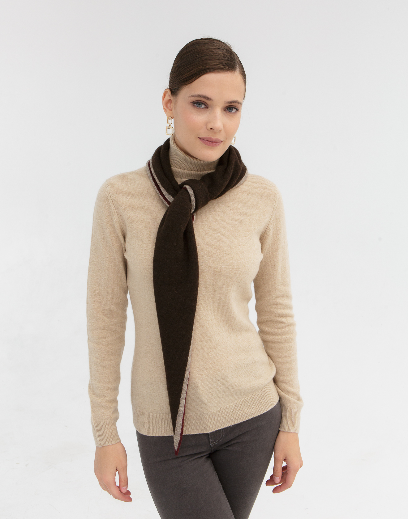 Легкий, мягкий и приятный к коже шарф обеспечивает тепло и комфорт в прохладную погоду. Компактная форма позволяет носить его различными способами, создавая как повседневные, так и более элегантные образы.