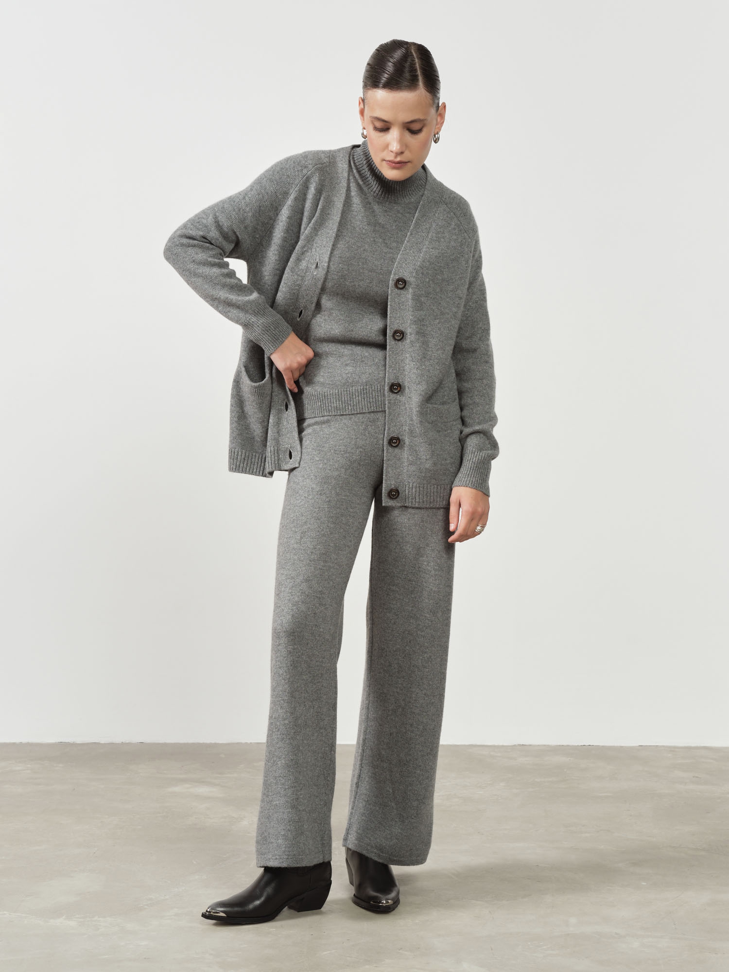 Модель выполнена с V-образным вырезом и застёжкой на пуговицы. Прямой крой и минималистичный стиль делают кардиган универсальным и практичным.