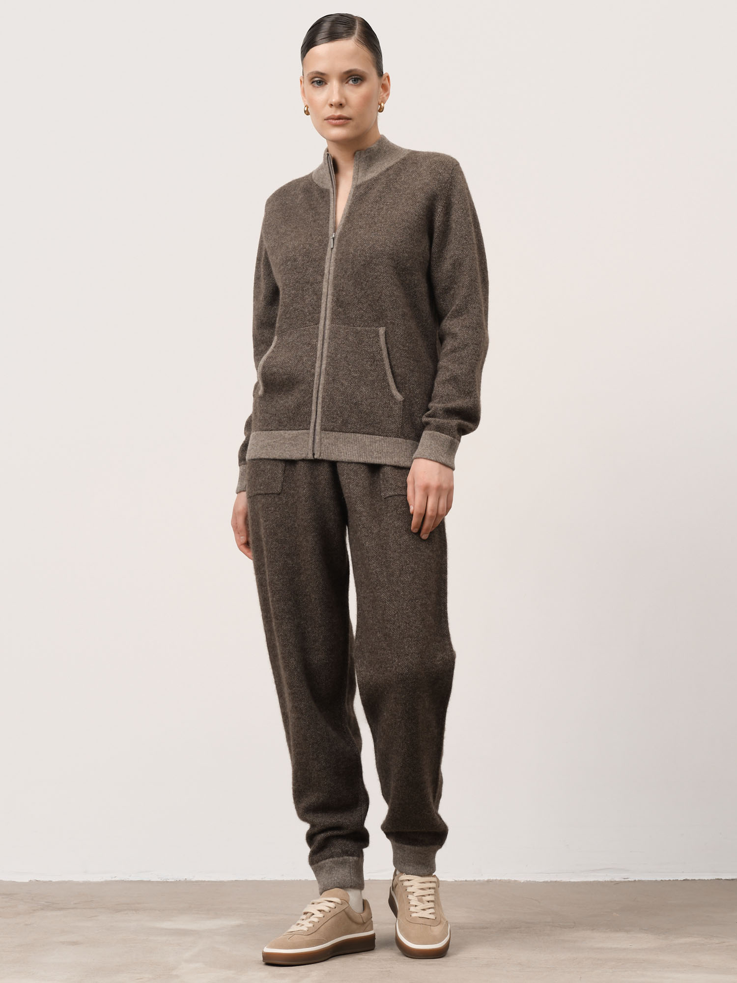 Замечательный костюм получается с брюками. С виду напоминает твид по расцветке. Мягкий, обволакивает. В нем очень тепло и комфортно. Полный восторг! Заказала дополнительно вторые брюки.