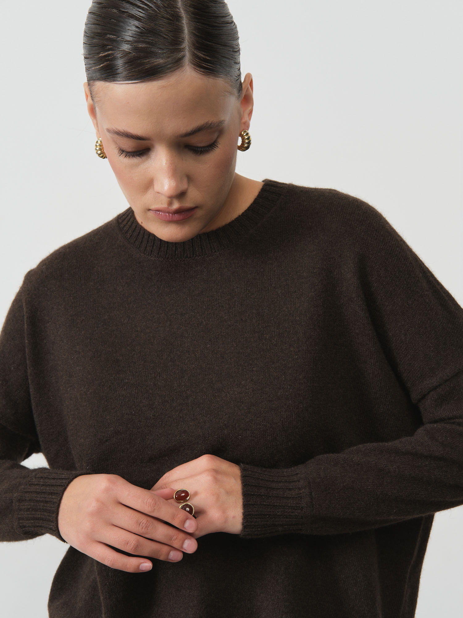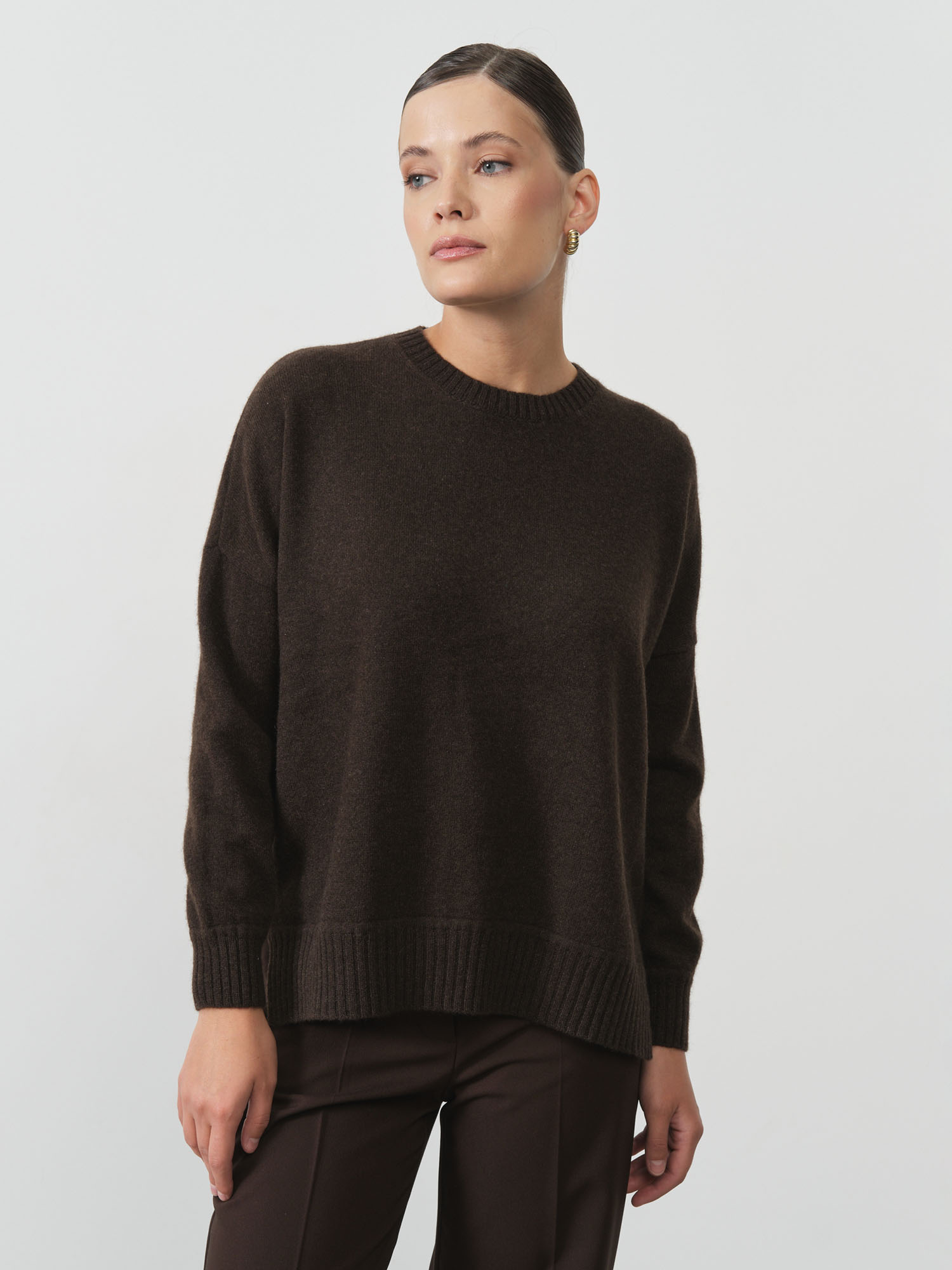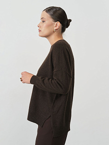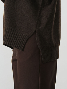 Модель выполнена в классическом прямом силуэте с круглой горловиной и гладкой вязкой. Минималистичный стиль подчёркивает благородную текстуру материала и делает изделие универсальным для разных образов.