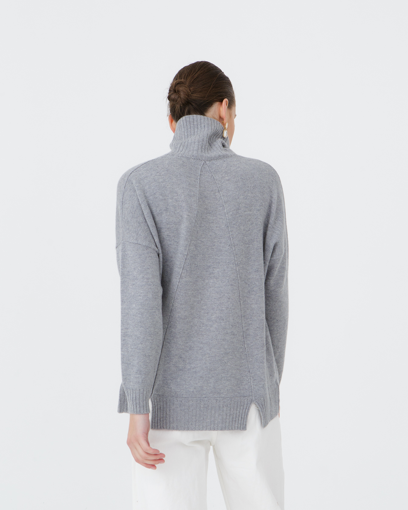 Модель выполнена с высоким воротником-стойкой и длинными рукавами. Лаконичный крой и минималистичный стиль делают джемпер универсальным элементом гардероба.