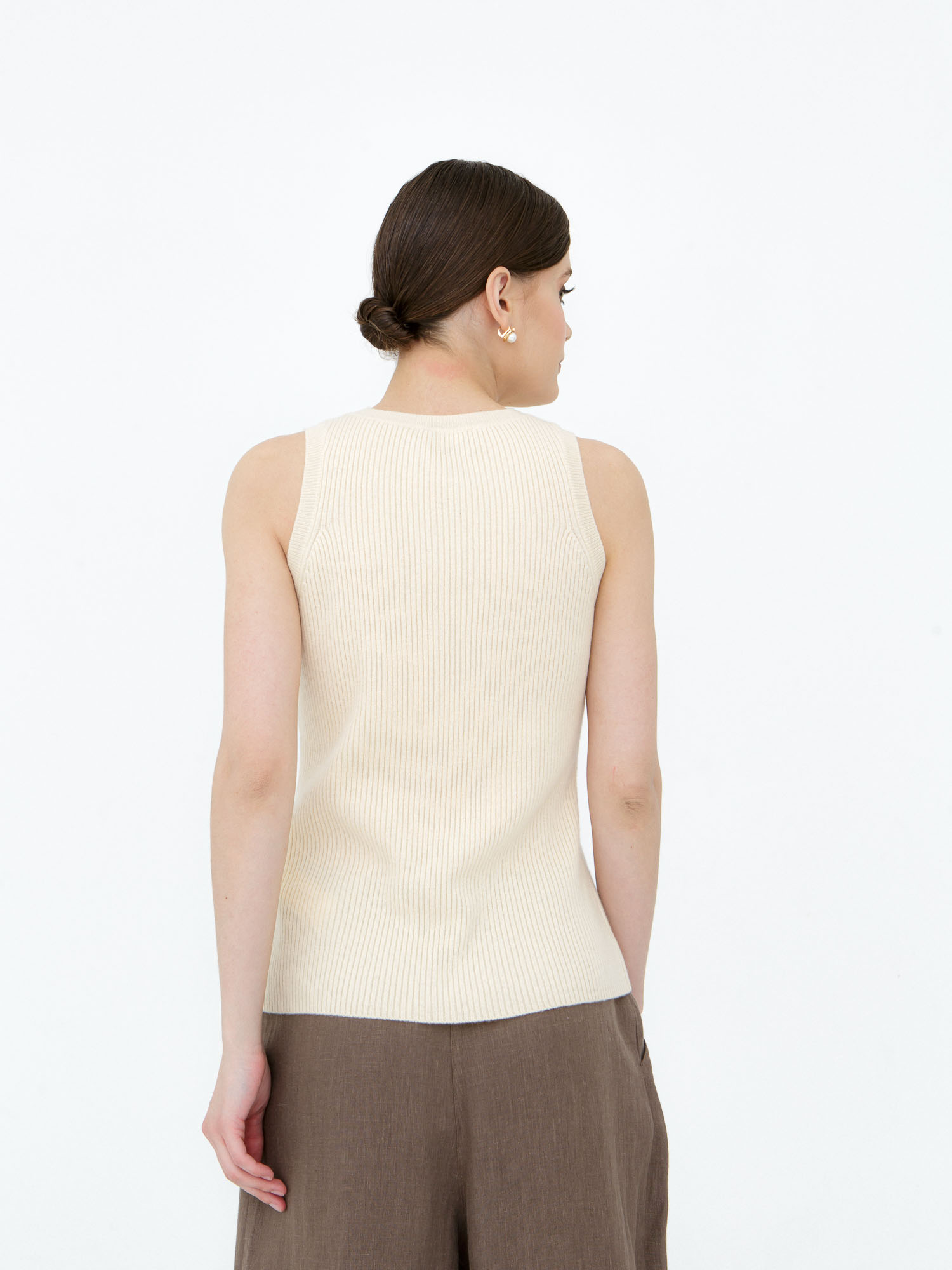 Минималистичный дизайн без рукавов с аккуратной круглой горловиной. Эластичная вязка по краю горловины и по низу изделия сохраняет форму и подчёркивает аккуратность силуэта.