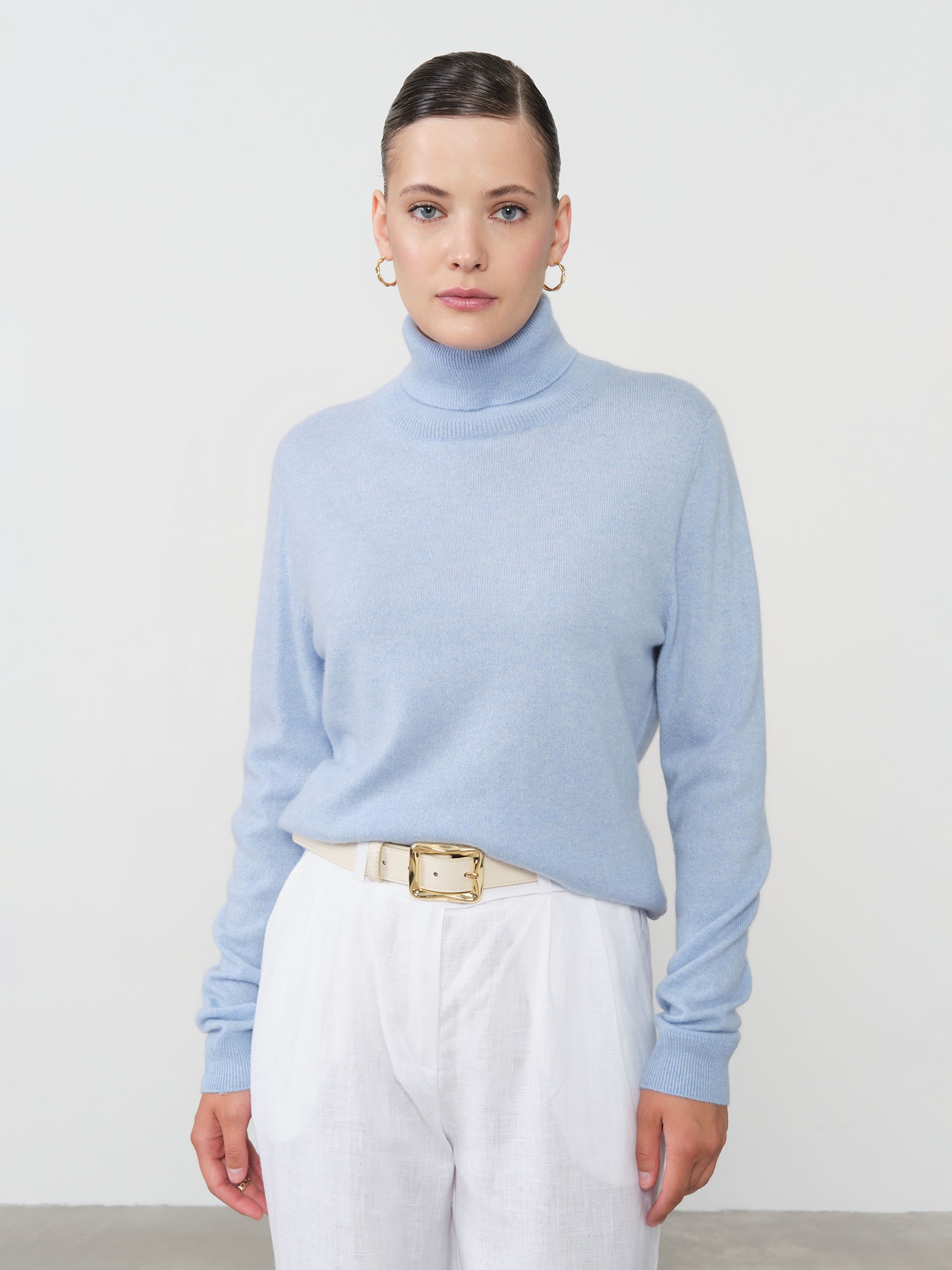 Нежный голубой цвет создает ощущение свежести и легко сочетается с различными элементами гардероба, будь то классические брюки, юбка или джинсы. Эта водолазка станет идеальным дополнением как для повседневного, так и для более официального стиля, добавляя нотку роскоши в ваш образ.