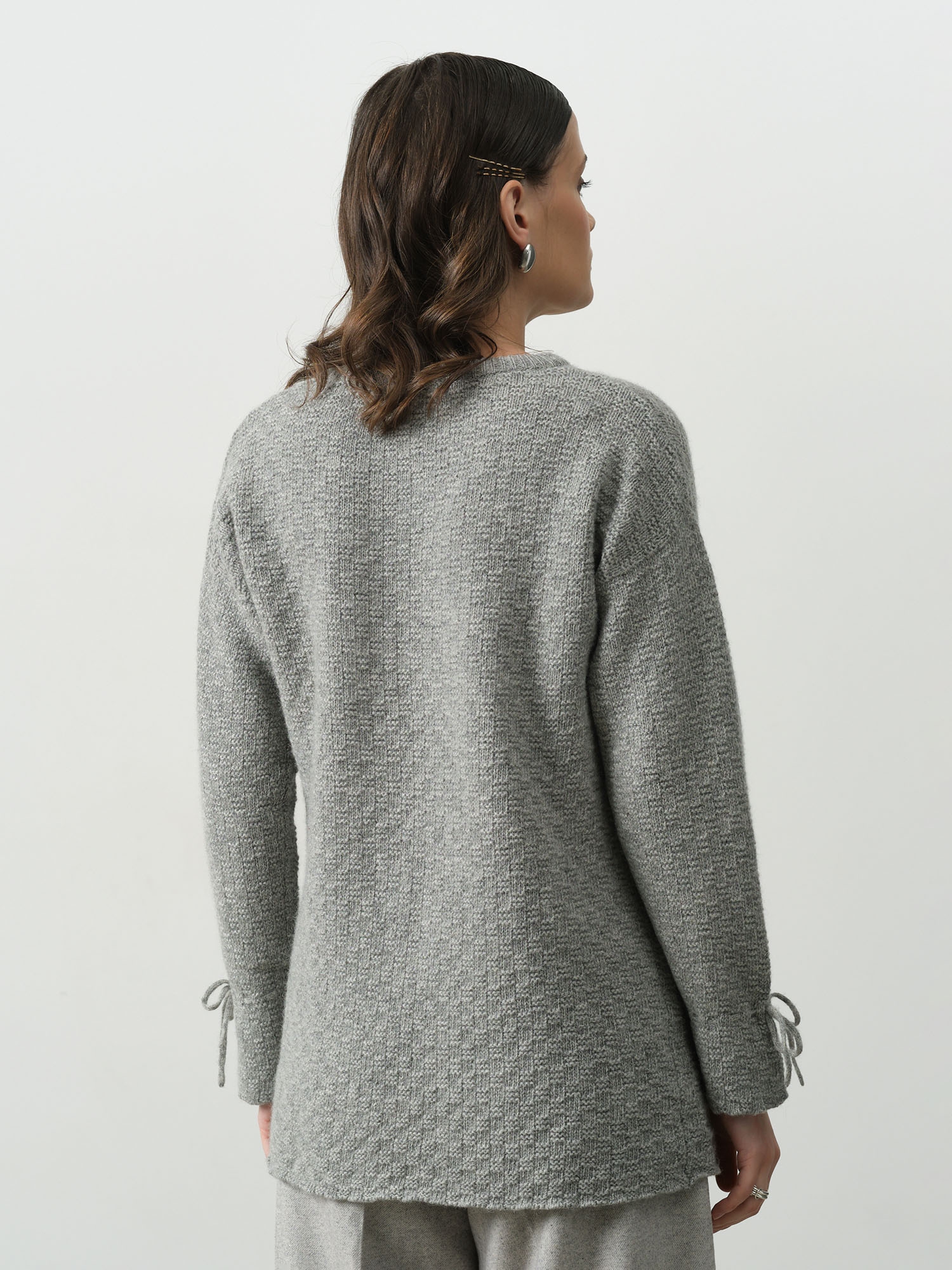 Круглый вырез горловины, длинные рукава с декоративными завязками по низу, аккуратная обработка краёв. Минималистичный дизайн делает модель универсальной для повседневных образов.