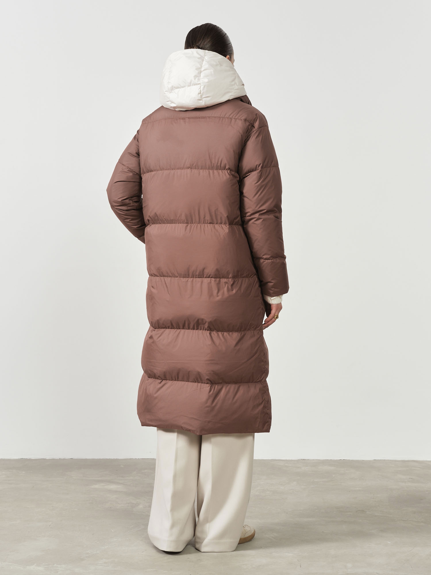 Объёмный высокий воротник-стойка защищает шею от ветра и холода, создаёт уют и добавляет модели современный характер.