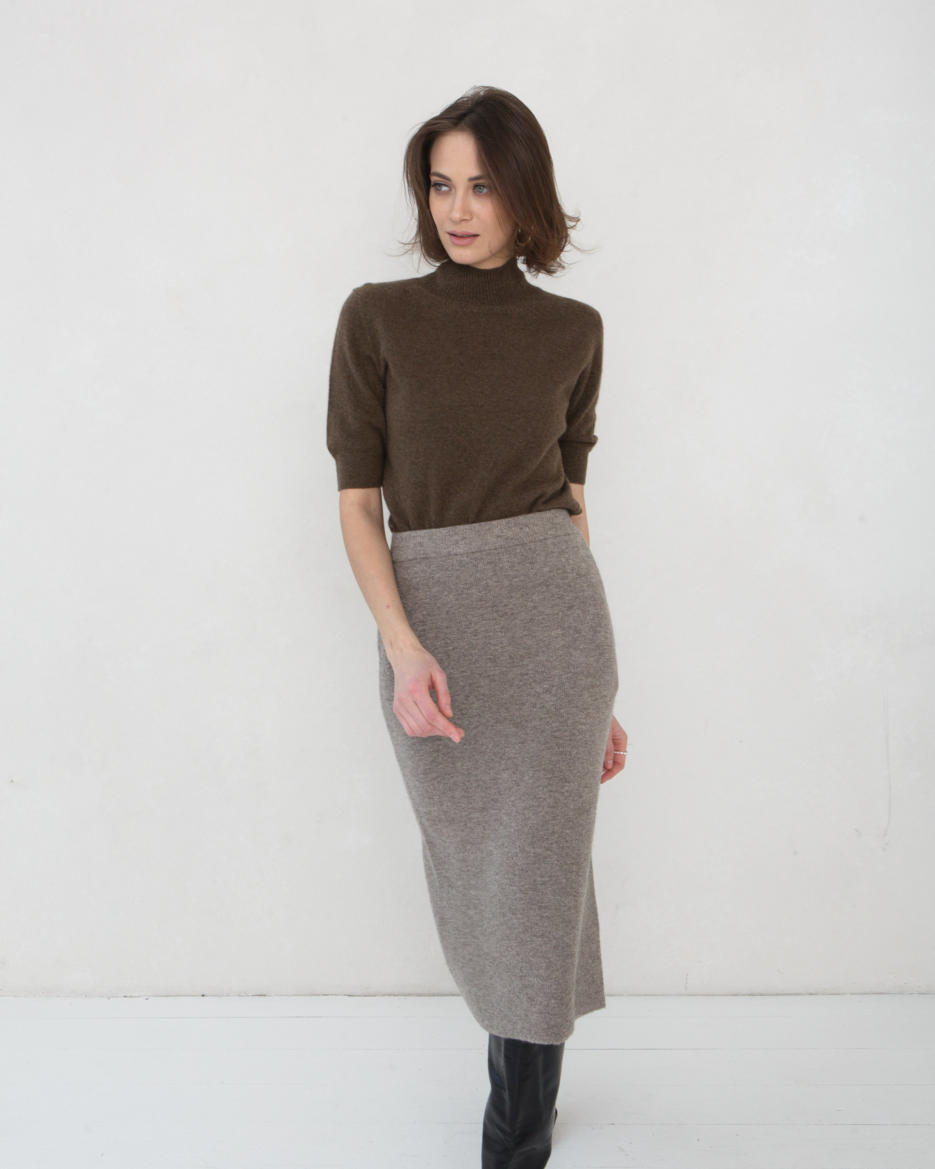 Эластичный пояс для комфортной посадки, аккуратный разрез сзади для свободы движений, мягкая трикотажная вязка, которая хорошо держит форму.