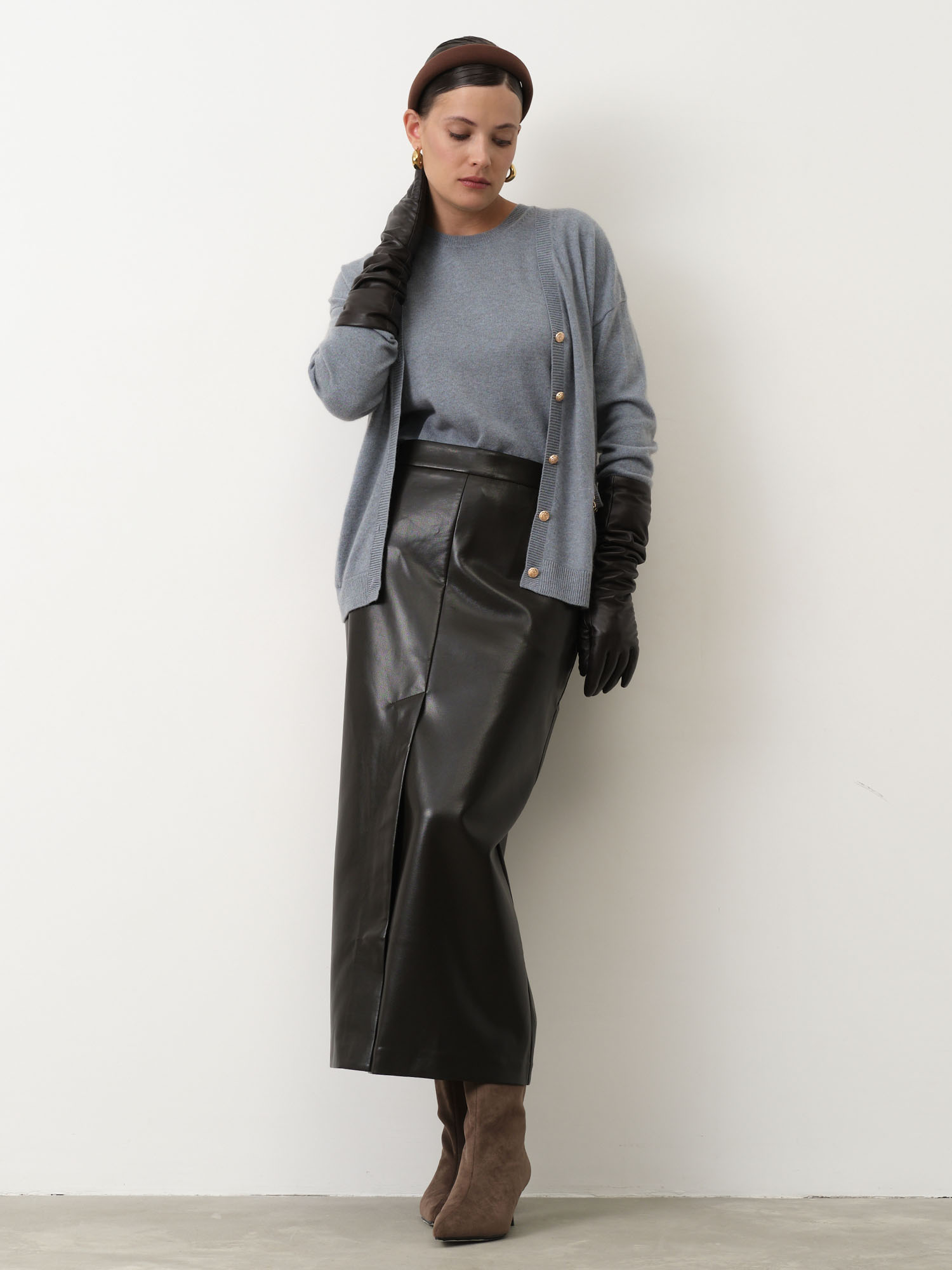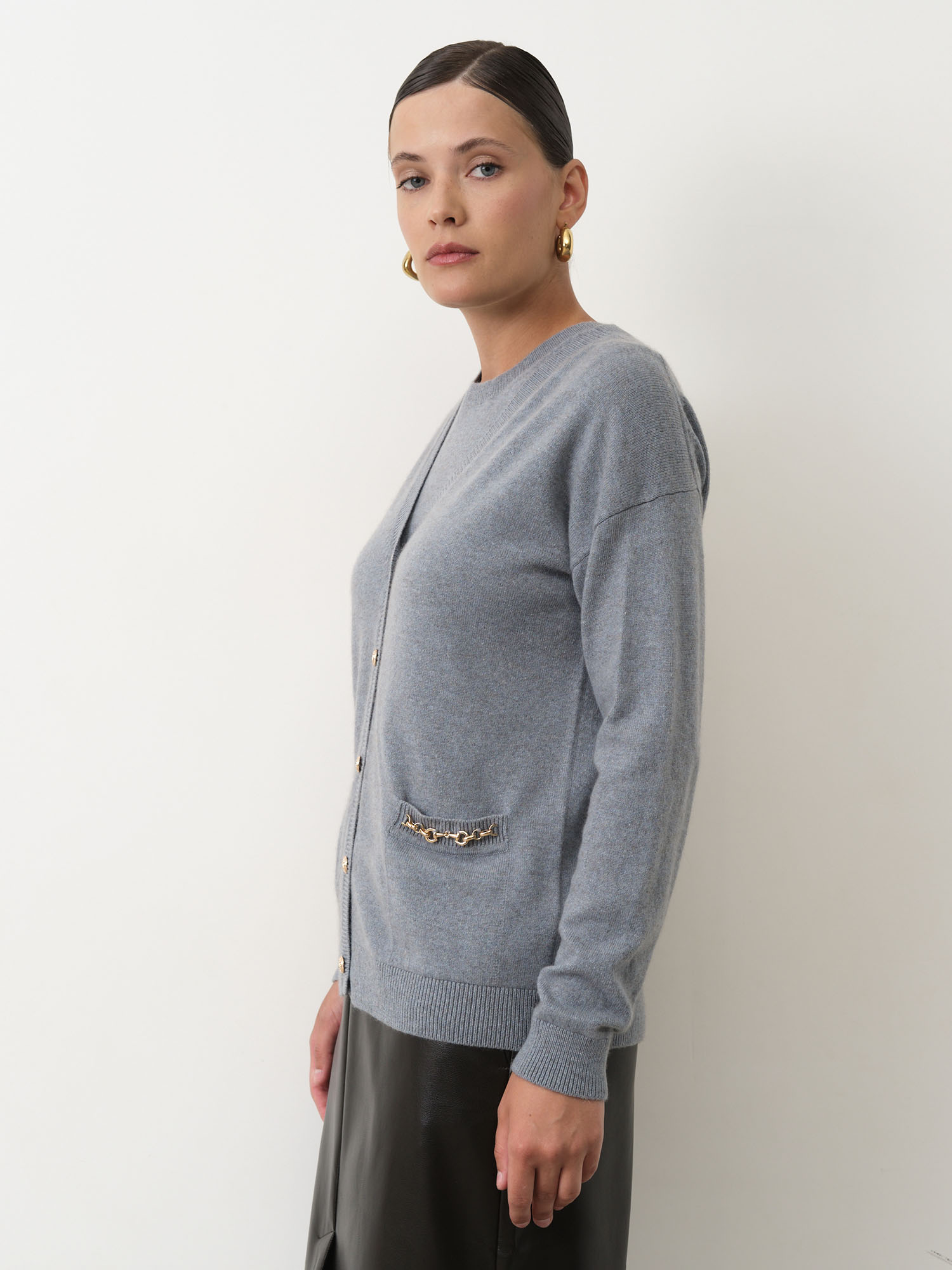 Застёжка на пуговицы, декоративные карманы с отделкой и изящными элементами, аккуратная трикотажная отделка манжет и нижнего края. Ровная вязка сохраняет форму изделия и подчёркивает качество материала.